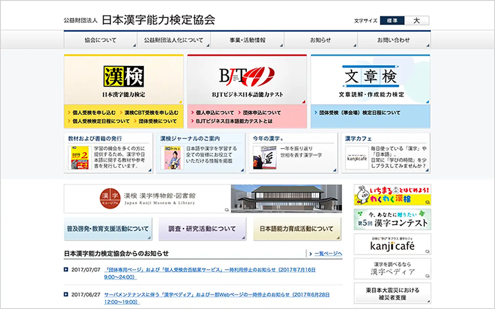 コーポレートサイトは、「漢字検定」を積極的に普及させるツールとして、また私たちの事業を知るファーストコンタクトの場として、非常に大きな役割を担っています。特に協会や検定の印象付けに重要な位置を占めています。キャンペーン情報の公開などを積極的に行って、潜在的・顕在的な受検者の皆さんに働きかけるなど、戦略的に使っていく必要があると思っています。
