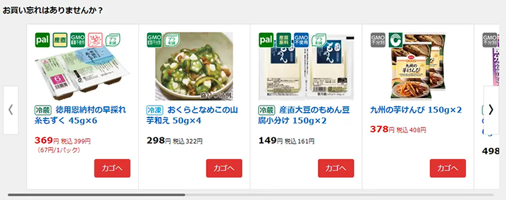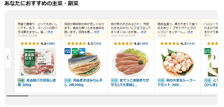 Amazon Personalizeによるレコメンド機能は、注文サイトのトップ画面の中ほどに表示し、未購入の商品でも興味を持ってもらえるよう、商品クチコミとあわせて表示される形にデザインも変更されました。