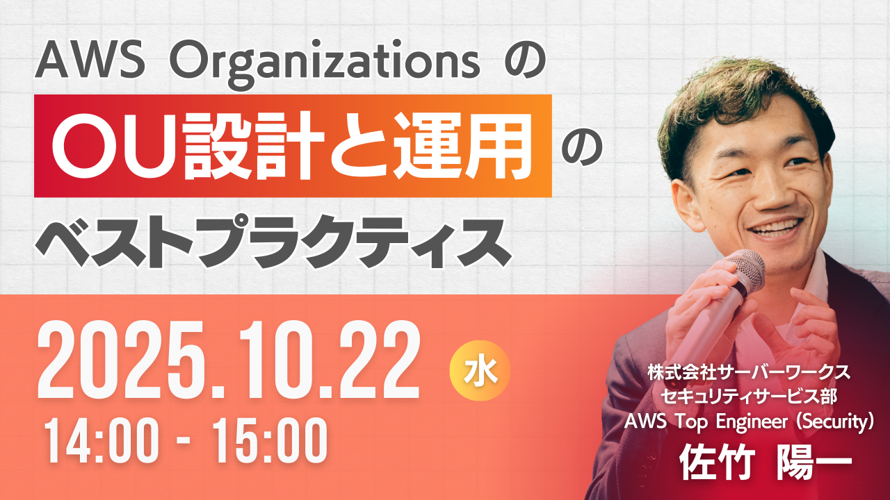 | 14:05-14:50 | AWS Organizations の OU 設計と運用の ベストプラクティス <登壇者> 株式会社サーバーワークス セキュリティサービス部 AWS Top Engineer (Security) 佐竹 陽一 |