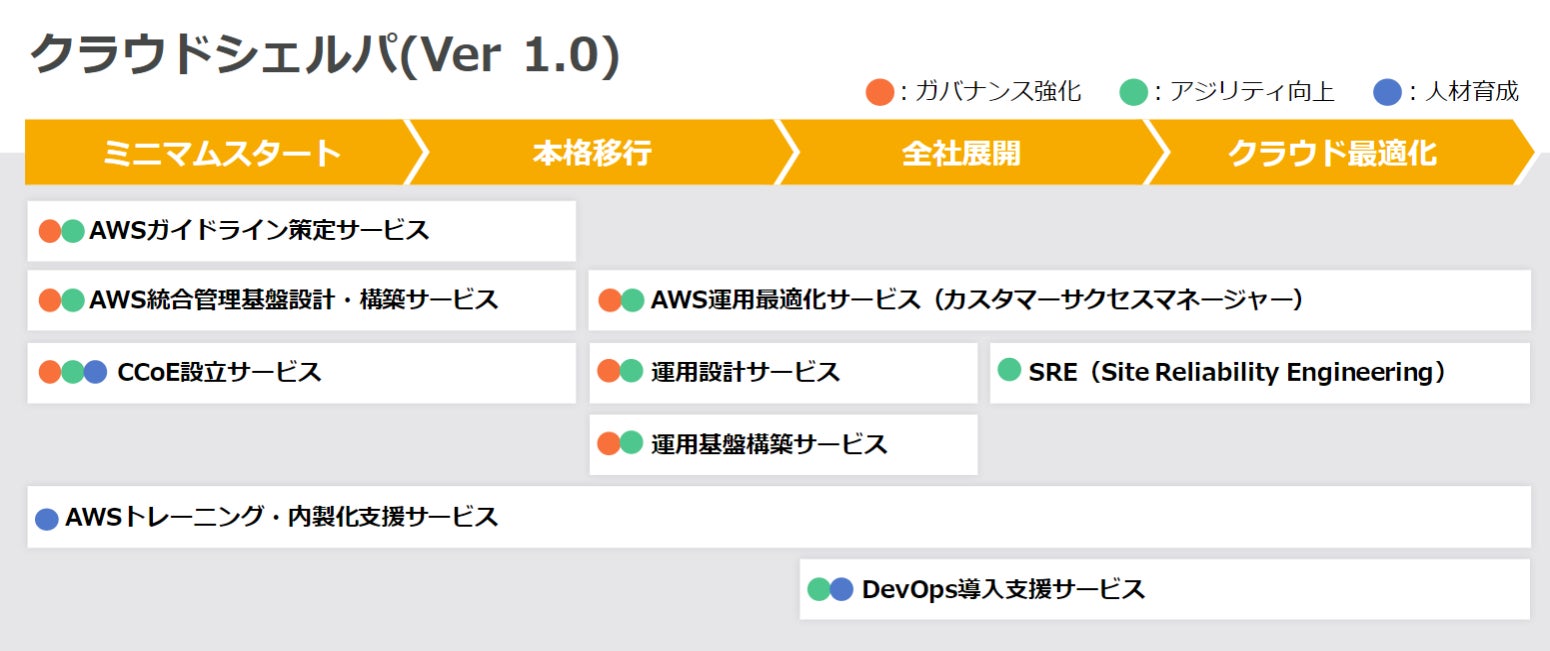 2023年11月27日にリリースしたクラウドシェルパでは、AWSを利用する企業で多く見られるガバナンス強化、アジリティ向上、人材育成の課題を解決するためにサービスをリリースし、以下サービスの展開をさせて頂いておりました。