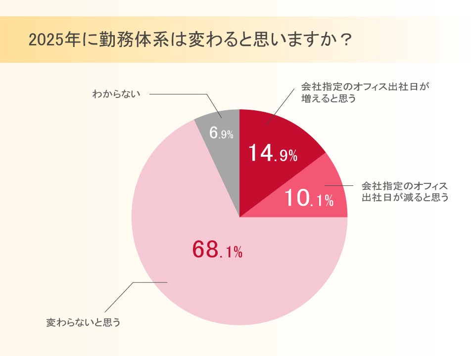 現在の勤務体系をたずねると、最も多いのは「完全オフィス勤務(毎日オフィスに出勤)」の31.5%で、次に「自由出勤制(リモートとオフィス勤務を自由に選べる)」の28.2%、一方「フルリモート」は18.1%でした。2024年に勤務体系が変わったかどうかたずねたところ、約3割の人が「会社指定のオフィス出社日が設定された」もしくは「会社指定のオフィス出社日が増えた」と回答し、一部に出社回帰の流れがあったことがわかります。2025年の勤務体系の予測についてたずねると「変わらないと思う」との回答が68.1%を占めました。
